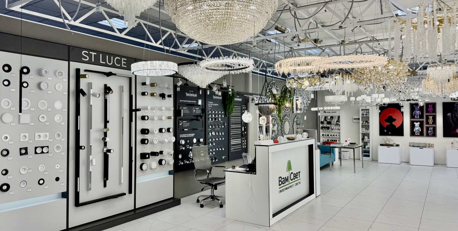 При этом мы предлагаем не только освещение, а также декор, картины, розетки и выключатели!